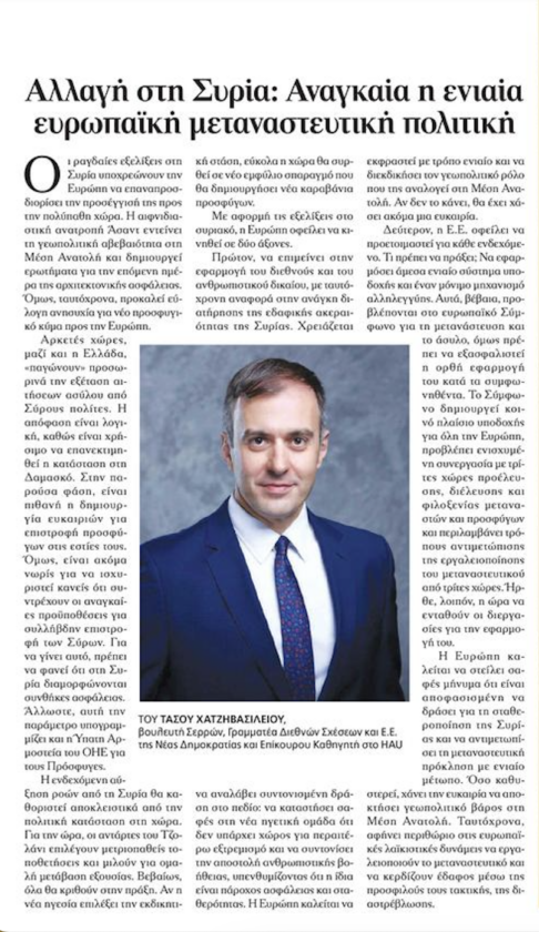 Άρθρο του Τάσου Χατζηβασιλείου στην «Today Press» – Αλλαγή στη Συρία Αναγκαία η ενιαία ευρωπαϊκή μεταναστευτική πολιτική