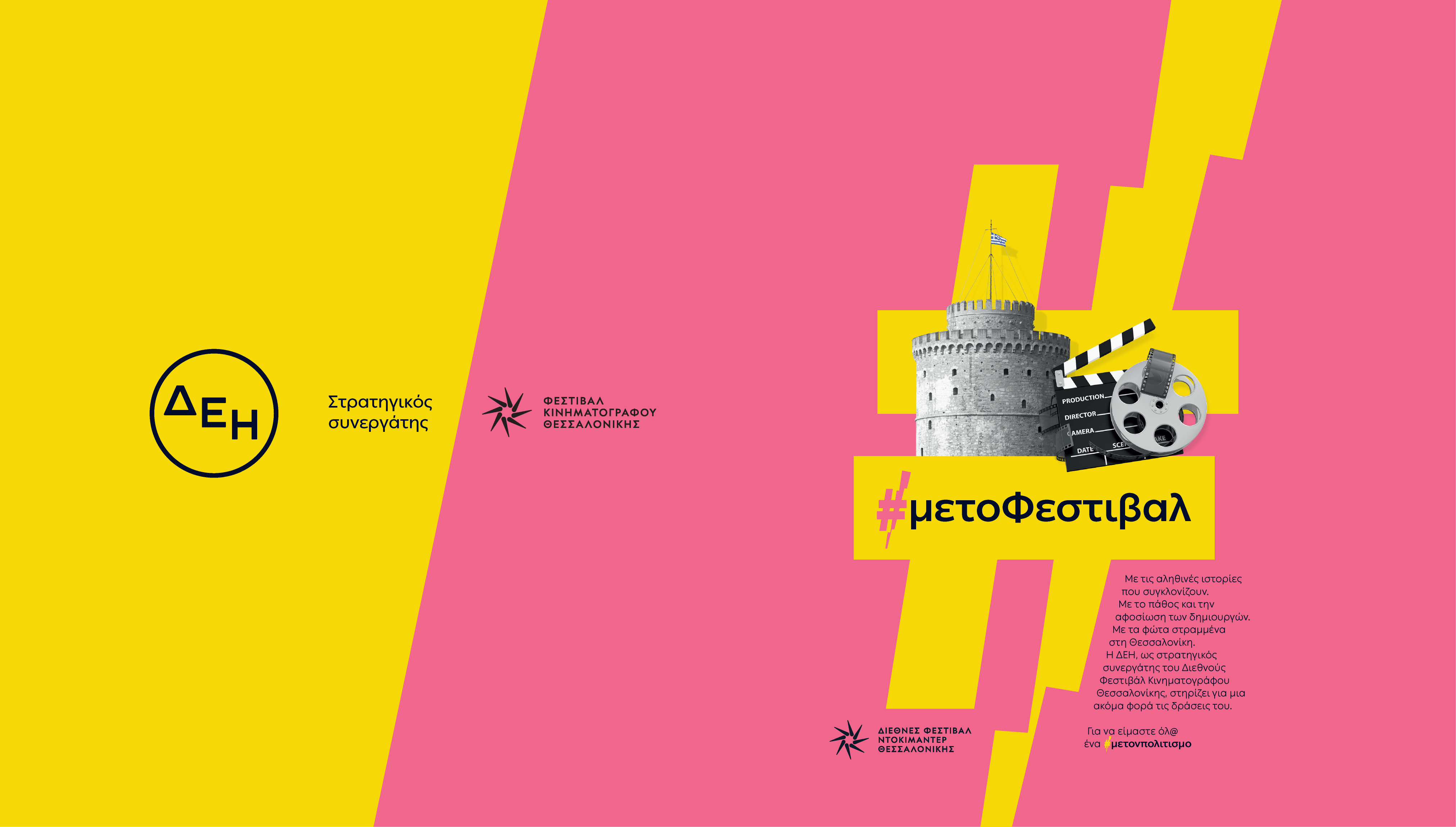 Με κεντρικά μηνύματά της «#μετοΦεστιβάλ», «είμαστε όλ@ ένα με τον πολιτισμό», η ΔΕΗ στρέφει τα φώτα στην Θεσσαλονίκη και τις αληθινές ιστορίες που συγκλονίζουν, υποστηρίζοντας ενεργά το πάθος και την αφοσίωση Ελλήνων και ξένων δημιουργών. Η ΔΕΗ στηρίζει ενεργά τις τέχνες και τον πολιτισμό, υποστηρίζοντας όλους και όσα μας οδηγούν στο μέλλον, ένα μέλλον καλύτερο για όλους, όπου τον πρώτο λόγο έχει ο πολιτισμός.