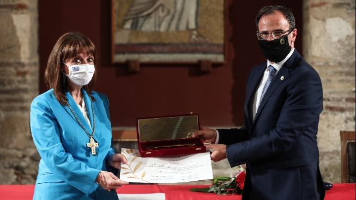 Στην προσφώνηση του ο δήμαρχος Αλέξανδρος Χρυσάφης είπε ότι στο πρόσωπο της Προέδρου της Δημοκρατίας “βλέπουμε την έκφραση του πνεύματος, της συναίνεσης, των αξιών, της ισότητας, της ισονομίας και της υπέρβασης των στερεοτύπων”.