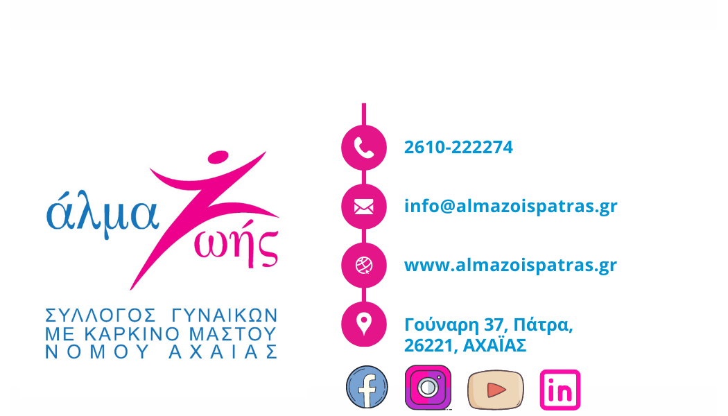 Με την ημερίδα αυτή, ο Σύλλογος Γυναικών με Καρκίνο Μαστού «Άλμα Ζωής» Ν. Αχαΐας, ξεκινά το Πρόγραμμα Αξιολόγησης & Πρόληψης Λεμφοιδήματος σε συνεργασία με την ΟΕΕ ΑΠΛΕΣΟ του Πανελληνίου Συλλόγου Φυσικοθεραπευτών.