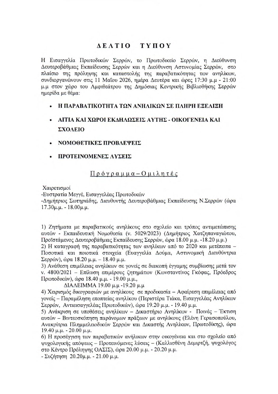 Ημερίδα απο την Εισαγγελία Σερρών ,την Αστυνομία και άλλους φορείς 28/04/202628/04/2026 cosmos Στις Σέρρες η εκδήλωση στις 11 Μαίου