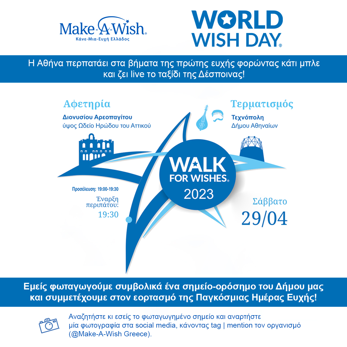 Εάν θέλετε να συμβάλλετε και εσείς, μπορείτε να μεταβείτε στο φωταγωγημένο σημείο, φορώντας κάτι μπλε, και να αναρτήσετε μία φωτογραφία στα social media, κάνοντας tag | mention τον οργανισμό (@Make-A-Wish Greece). Όλοι μαζί θα βοηθήσουμε τον οργανισμό να φτάσει σε ΟΛΑ τα παιδιά που έχουν ΑΝΑΓΚΗ από την εκπλήρωση της ευχής τους!