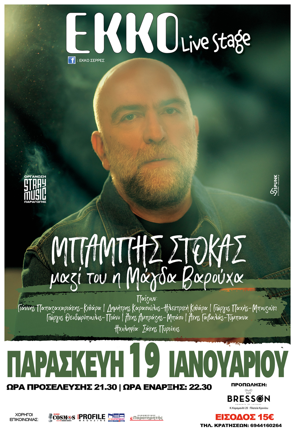 Με αγαπημένα παλιά και νεα τραγούδια του ο Μπαμπης Στοκας επισκέπτεται τις Σερρες. Μαζί του και η ταλαντούχος ερμηνεύτρια Μάγδα Βαρούχα. Η συναυλία θα γίνει στο ΕΚKΟ LIVE STAGE. Xορηγός επικοινωνίας COSMOS radio93 fm
