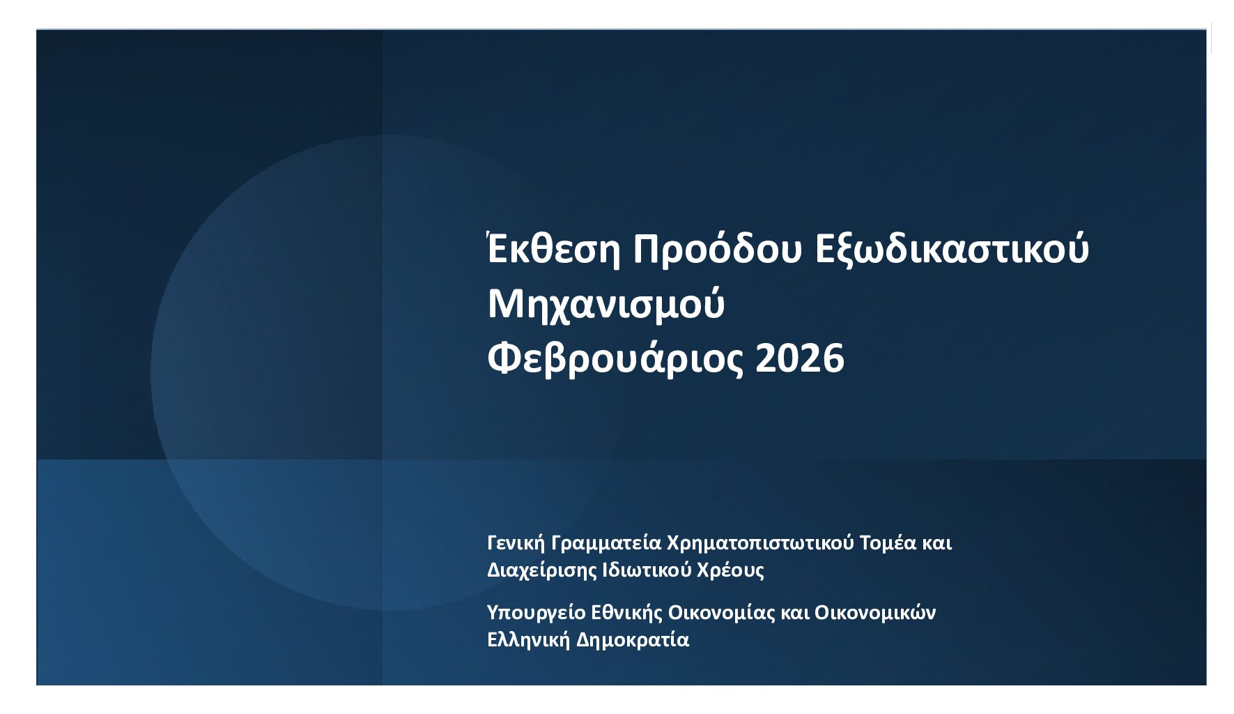 Διμερείς ρυθμίσεις με Χρηματοδοτικούς ΦορείςΕνισχυμένη δυναμική συνεχίζουν να εμφανίζουν και οι διμερείς ρυθμίσεις δανείων με τους 4 μεγαλύτερους Servicers (Intrum, Cepal, DoValue, Qquant). Τον μήνα  Ιανουάριο 2026 καταγράφηκαν ρυθμίσεις συνολικού ύψους 309 εκ. ευρώ, οι οποίες αναλογούν σε  4.705 οφειλέτες.Στοιχεία ΜΕΔ συστημικών ΤραπεζώνΣύμφωνα με τα στοιχεία κλεισίματος του έτους 2025 σχεδόν το 50% των Μη Εξυπηρετούμενων Δανείων (ΜΕΔ) που βρίσκονται στα χαρτοφυλάκια των τεσσάρων  συστημικών Τραπεζών είναι καταγγελμένα ενώ κατά μέσο όρο το 15% των ΜΕΔ βρίσκεται σε καθεστώς ρύθμισης.Τέλος, υπενθυμίζεται ότι, με στόχο την αποτελεσματικότερη αξιοποίηση των διαθέσιμων εργαλείων ρύθμισης οφειλών, η Γενική Γραμματεία Χρηματοπιστωτικού Τομέα και Διαχείρισης Ιδιωτικού Χρέους παρέχει πανελλαδική εξυπηρέτηση με βιντεοκλήση ή τηλεφωνικά, κατόπιν ραντεβού, μέσω της πλατφόρμας (https://www.gov.gr/ipiresies/polites-kai-kathemerinoteta/ex-apostaseos-exuperetese-politon/exuperetese-me-telediaskepse-kai-telephonike-epikoinonia-apo-ten-eidike-grammateia-diakheirises-idiotikou-khreous-egdikh) ή στο τηλέφωνο 213.212.5730.