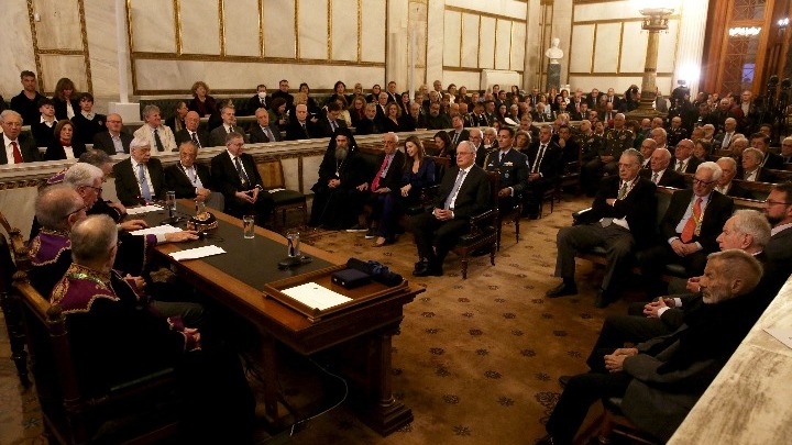Υπενθυμίζοντας τις κατευθυντήριες γραμμές που είχε χαράξει στην πανηγυρική εναρκτήρια ομιλία του το 1926 ο τότε υπουργός Παιδείας κι Ακαδημαϊκός Δημήτριος Αιγινίτης για την διάδοση της γλώσσας, της επιστήμης, των και των μεγάλων επιτευγμάτων του ανθρώπου, ο Πρόεδρος της Δημοκρατίας τόνισε πως “το το ίδρυμα έχει γίνει ένας θεσμό,ς ο οποίος έκτοτε επιβεβαιώνει καθημερινά ότι η γνώση χρειάζεται κοινότητα ακροατήριο” και απαρίθμησε όλους τους τομείς στους οποίους η Ακαδημία προσφέρει το ερευνητικό της έργο με καινοτόμες δράσεις, συμπόσια, βραβεία και υποτροφίες “για την ενθάρρυνση νέων επιστημόνων, ερευνητών και δημιουργών”. Στάθηκε δε ιδιαίτερα στο μνημόνιο συνεργασίας της Ακαδημίας με τη Βουλή των Ελλήνων για την ενίσχυση της εξωστρέφειας του θεσμού και την ενδυνάμωση των θεσμών από τη συνεργασία αυτή.