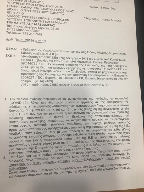 Στην διαταγή αναφέρεται ότι η απόφαση αυτή ελήφθη στο πλαίσιο της ανάγκης περιορισμού και αντιμετώπισης της πανδημίας και λόγω των ιδιαίτερων συνθηκών εργασίας της ΕΜΑΚ, καθώς εντάσσονται στον Ευρωπαϊκό Μηχανισμό Πολιτικής Προστασίας και είναι πολύ πιθανόν να μεταβούν στο εξωτερικό για παροχή βοήθειας πολιτικής προστασίας, με έξοδα της Ε.Ε., αλλά και για επιχειρησιακές επεμβάσεις σε όλη την επικράτεια, γι’ αυτό κρίνεται απαραίτητος ο εμβολιασμός όλων των υπηρετούντων στις συγκεκριμένες υπηρεσίες.