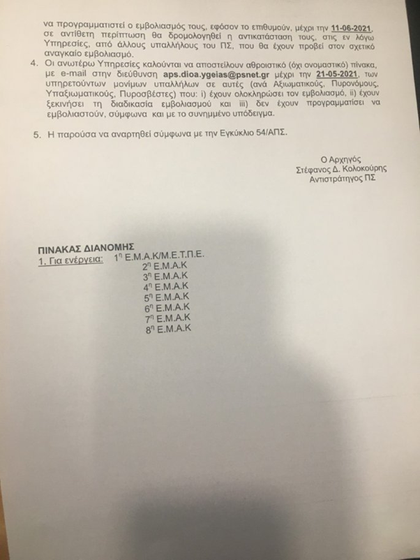 Στο πλαίσιο αυτής της διαταγής καλούνται οι υπηρεσίες να αποστείλουν στο Αρχηγείο μέχρι την 21-5-2021, αθροιστικό κατάλογο, (όχι ονομαστικό), όσων έχουν ολοκληρώσει τον εμβολιασμό, όσων έχουν ξεκινήσει τη σχετική διαδικασία και όσων δεν έχουν προγραμματίσει να εμβολιαστούν.