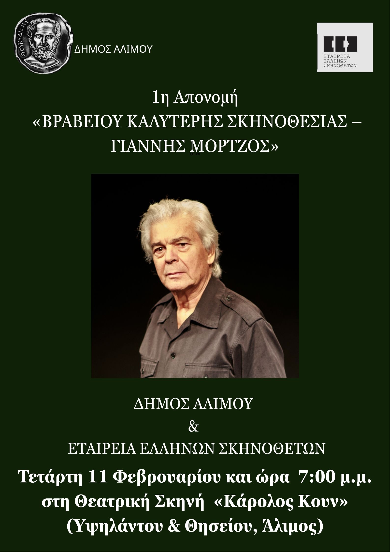 Ο Δήμος Αλίμου και η Εταιρεία Ελλήνων Σκηνοθετών συνέπραξαν, για νατιμήσουν μία ξεχωριστή προσωπικότητα του σύγχρονου ελληνικού πολιτισμού,τον ηθοποιό, σκηνοθέτη και συγγραφέα Γιάννη Μόρτζο. Η σύμπραξη αυτήοδήγησε στην καθιέρωση ενός νέου θεσμού στον χώρο του σύγχρονουελληνικού θεάτρου: το «Βραβείο Καλύτερης Σκηνοθεσίας – ΓιάννηςΜόρτζος».Ο Γιάννης Μόρτζος, σπουδαίος άνθρωπος της Τέχνης και του ελληνικούΠολιτισμού, ήταν δημότης Αλίμου. Με το εξαιρετικό ταλέντο του και το μοναδικόήθος του, άφησε ένα μεγάλο έργο τόσο στο θέατρο Τέχνης, ένας από τουςτελευταίους πρωταγωνιστές της περιόδου του Κάρολου Κουν, αλλά καισυνεχίζοντας μια μεγάλη προσωπική καριέρα, ενεργός μέχρι το…