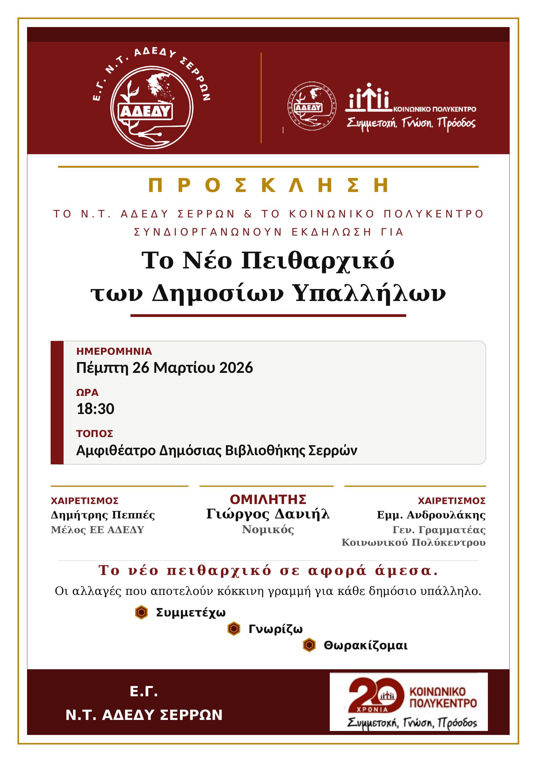 Το Ν.Τ. ΑΔΕΔΥ Σερρών, σε συνεργασία με το Κοινωνικό Πολύκεντρο, διοργανώνει μιακρίσιμη ενημερωτική εκδήλωση με θέμα: «Το Νέο Πειθαρχικό των Δημοσίων Υπαλλήλων». Η εκδήλωση θα πραγματοποιηθεί την Πέμπτη 26 Μαρτίου 2026 και ώρα 18:30, στοΑμφιθέατρο της Δημόσιας Κεντρικής Βιβλιοθήκης Σερρών.Στο επίκεντρο της ημερίδας θα βρεθούν οι πρόσφατες νομοθετικές αλλαγές πουαναμορφώνουν το πειθαρχικό δίκαιο, εισάγοντας νέα δεδομένα στην υπηρεσιακήκαθημερινότητα και την εργασιακή ασφάλεια χιλιάδων υπαλλήλων.Κεντρικός ομιλητής θα είναι ο νομικός Γιώργος Δανιήλ, ο οποίος θα αναλύσει τις νέεςδιατάξεις και θα απαντήσει σε καίρια ερωτήματα σχετικά με την εφαρμογή τους.Η εκδήλωση στοχεύει…