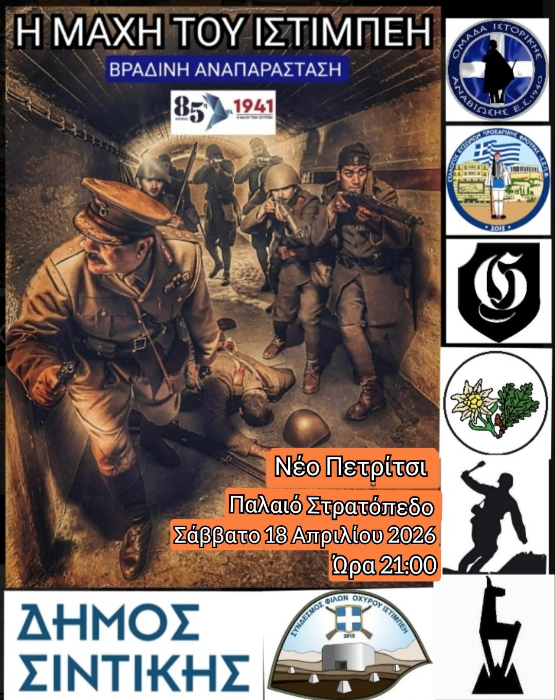 Για δεύτερη χρονιά ο Σύνδεσμος Φίλων Οχυρού Ιστίμπεη μαζί με τον Δήμο Σιντικής διοργανώνουν την ΒΡΑΔΙΝΗ αναπαράσταση της Μάχης του Ιστίμπεη στο Παλαιό Στρατόπεδο Νέου Πετριτσίου το Σάββατο 18 Απριλίου στις 21:00 μ.μ. με εντυπωσιακά εφέ ήχου και φωτισμού! Θα συμμετέχουν αναβιωτικές ομάδες από την Πολωνία, την Σλοβακία και την Αθήνα με την καθοδήγηση του καταξιωμένου σκηνοθέτη ιστορικών ταινιών κ.Βασίλη Τσικάρα! ΜΗΝ ΤΟ ΧΑΣΕΤΕ!