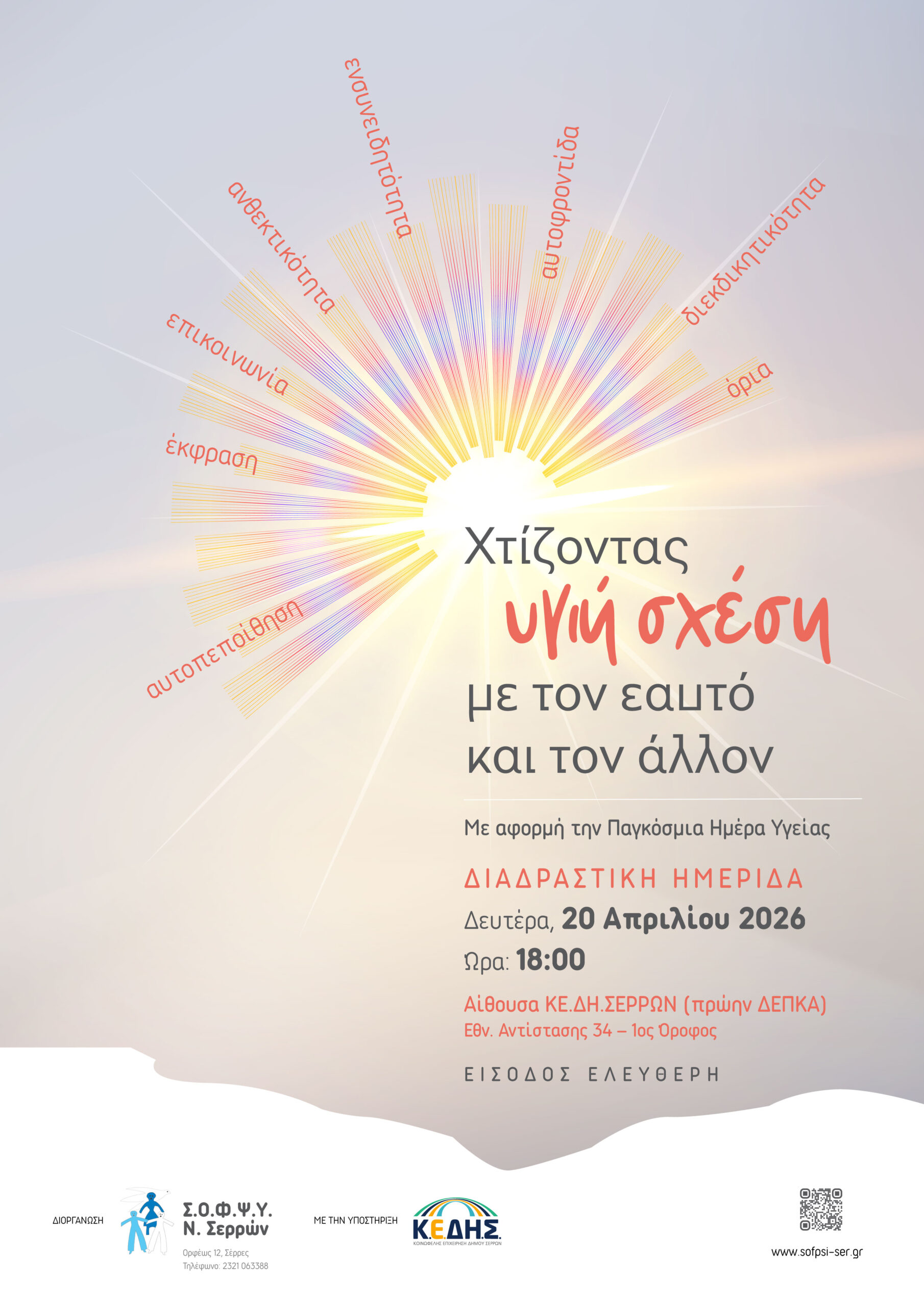 Με αφορμή την Παγκόσμια Ημέρα Υγείας, ο Σύλλογος Οικογενειών/Φροντιστών και Φίλων για την Ψυχική Υγεία, τη Νόσο Alzheimer και Συγγενείς Διαταραχές (ΣΟΦΨΥ) Ν. Σερρών σε συνεργασία με το Κέντρο Ημέρας και την Κινητή Μονάδα Ψυχικής Υγείας «Ε.Ν.ΟΡΑΜΑ» στις 20/04/2026, ημέρα Δευτέρα και ώρα 18:00, διοργανώνουν Διαδραστική Ημερίδα με γενικό τίτλο: «Χτίζοντας Υγιή Σχέση με τον Εαυτό και τον Άλλον» και θέματα που μας προβληματίζουν όλους. Σας περιμένουμε να μιλήσουμε για όλα αυτά και να ανακαλύψουμε μαζί τις απαντήσεις! Πρόγραμμα Ημερίδας 6:00 Χαιρετισμοί 6:15-6:45 «Ψυχική Ανθεκτικότητα: η τέχνη του να λυγίζεις χωρίς να σπας» Εφραιμίδου Νατάσα, Κοινωνική Λειτουργός 6:45-7:15 «Αυτοπεποίθηση και Διεκδικητικότητα: ο “μαγικός” συνδυασμός» Γιαννακίδου Άννα-Μαρία, Ψυχολόγος-Ψυχοθεραπεύτρια 7:15-7:45 «Social Media…