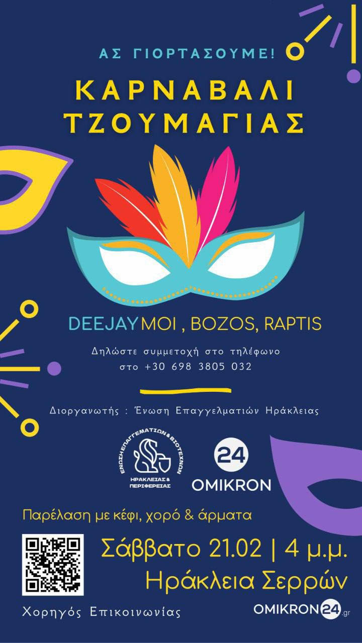 Το “Καρναβάλι Τζουμαγιάς” επιστρέφει το Σάββατο 21 Φεβρουαρίου 2026 στην Ηράκλεια Σερρών, δίνοντας το σύνθημα για μια εκδήλωση γεμάτη κέφι, χορό και αποκριάτικη διάθεση. Διοργανωτής είναι η Ένωση Επαγγελματιών και Βιοτεχνών Ηράκλειας και Περιφέρειας. Στο πλαίσιο των εκδηλώσεων θα πραγματοποιηθεί αποκριάτικη παρέλαση στις 4:00 μ.μ., με τη συμμετοχή ομάδων καρναβαλιστών και εντυπωσιακών αρμάτων, δημιουργώντας μια ξεχωριστή γιορτινή ατμόσφαιρα. Σας περιμένουμε όλους να ζήσουμε τον ρυθμό της Αποκριάς!