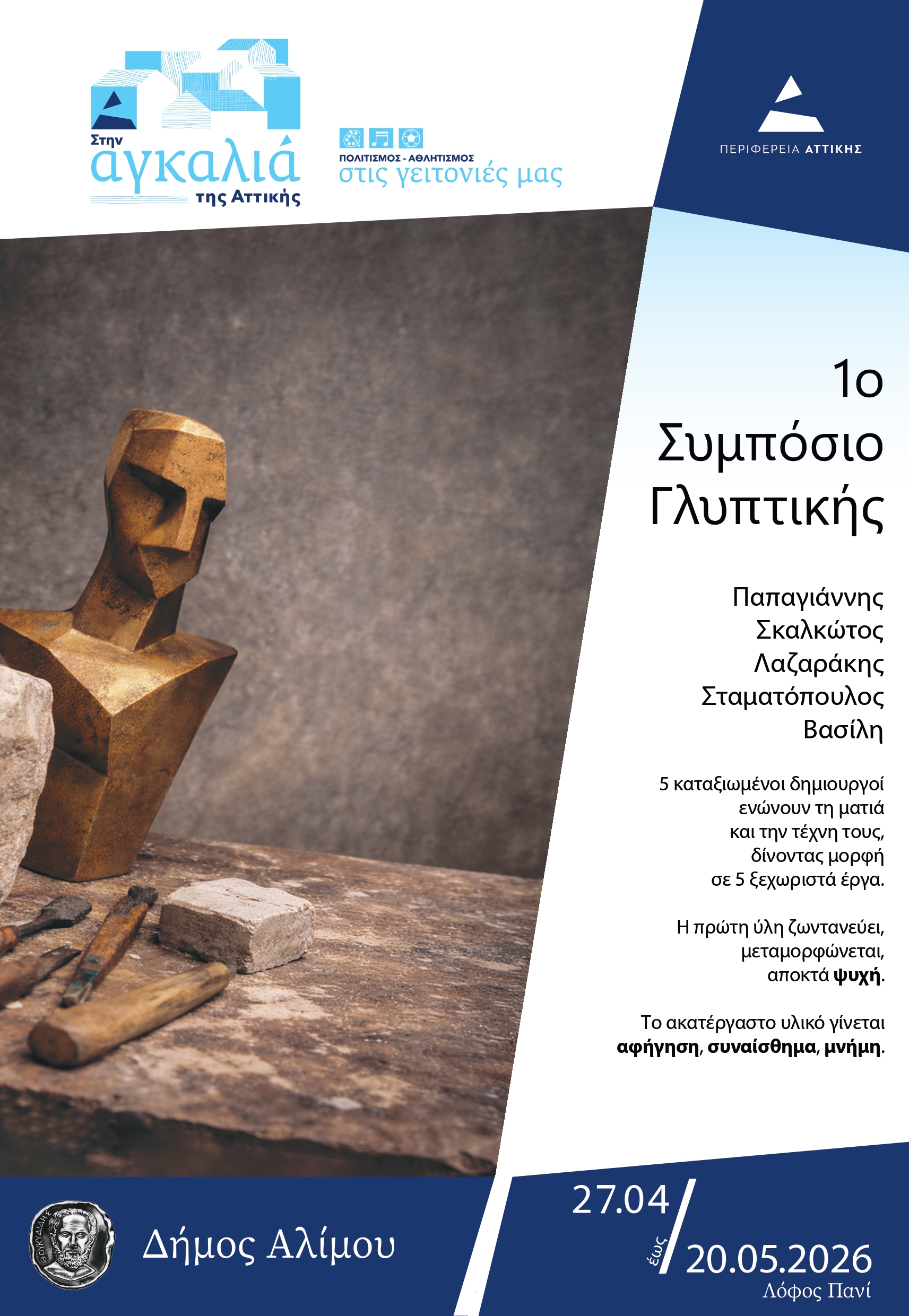Ο Δήμος Αλίμου και η Περιφέρεια Αττικής διοργανώνουν το 1 ο Συμπόσιο Γλυπτικής Αλίμου. Πέντεκορυφαίοι και πολυβραβευμένοι γλύπτες, ο Θόδωρος Παπαγιάννης, ο Βασίλης Βασίλη, ο ΧρήστοςΛαζαράκης, ο Δημήτρης Σκαλκώτος και ο Γιώργος Σταματόπουλος, από τις 27 Απριλίου έως τις20 Μαΐου 2026 θα σμιλεύουν το ακατέργαστο υλικό τους στον Λόφο Πανί δημόσια, μπροστάστο κοινό.Ο Λόφος Πανί μετατρέπεται, στη διάρκεια αυτής της ζωντανής πολιτιστικής εκδήλωσης, σεανοιχτό εργαστήριο Γλυπτικής, ενώ τα έργα που θα φιλοτεχνήσουν οι καταξιωμένοι γλύπτες θαπαραμείνουν στον Λόφο δημιουργώντας μια μόνιμη υπαίθρια γλυπτοθήκη στον Άλιμο.Δεν υπάρχει εισιτήριο, ο Λόφος είναι…